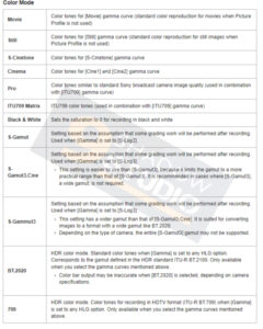 5.2 Gamma (Kiểm soát phân bổ tương phản, và độ sáng) Still & Movie: đây là các đường cong gamma tiêu chuẩn do Sony cung cấp. Những gamma này có độ tương phản (contrast) cao nhất và có phạm vi động thấp nhất. Sony họ cung cấp cho cảnh quay mì-ăn-liền nhưng hậu kỳ sẽ kém vất. Cine gamma: có dải động khá cao và độ tương phản nhẹ, giảm nhiễu tốt chụp/quay đêm👍. Cine1 và Cine2 có độ tương phản nhẹ hơn so với Cine3, Cine4. S-log gamma: Slog 2-3 dành cho hậu kỳ chuyên nghiệp nên mình khuyến nghị không dùng nhé.